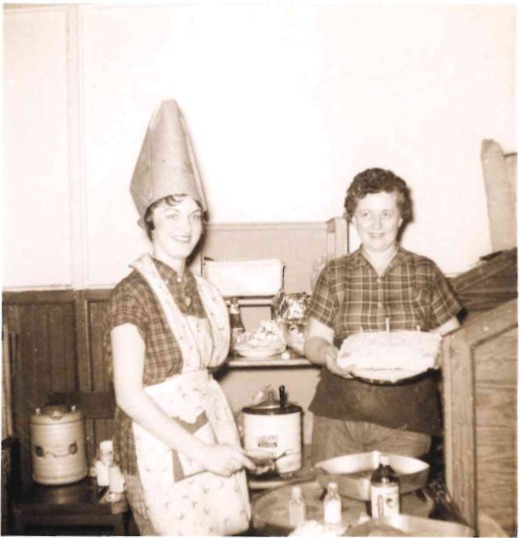 The picture shows my mom in a hat at work, celebrating her 18th birthday. They had gathered in the place where they took breaks at lunch to enjoy it together. My mom is wearing the hat while a coworker holds her cake.